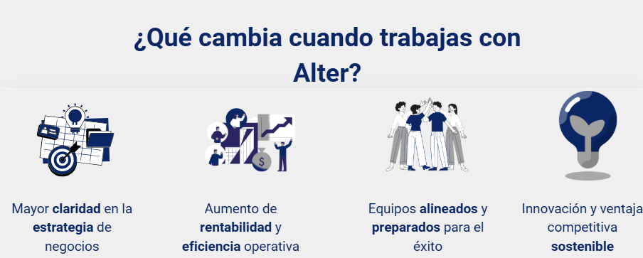 En Alter Business Consulting ayudamos a empresas a optimizar sus procesos, desarrollar estrategias efectivas y potenciar su crecimiento con soluciones personalizadas y resultados medibles para que tu empresa alcance su máximo potencial.